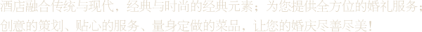 宴会大厅敞宽1000平方米,可容350-400人宾客就餐,多媒体投影、等离子显示、高科技灯光音响、化的服务队伍,是举办婚庆活动的更佳场所。...